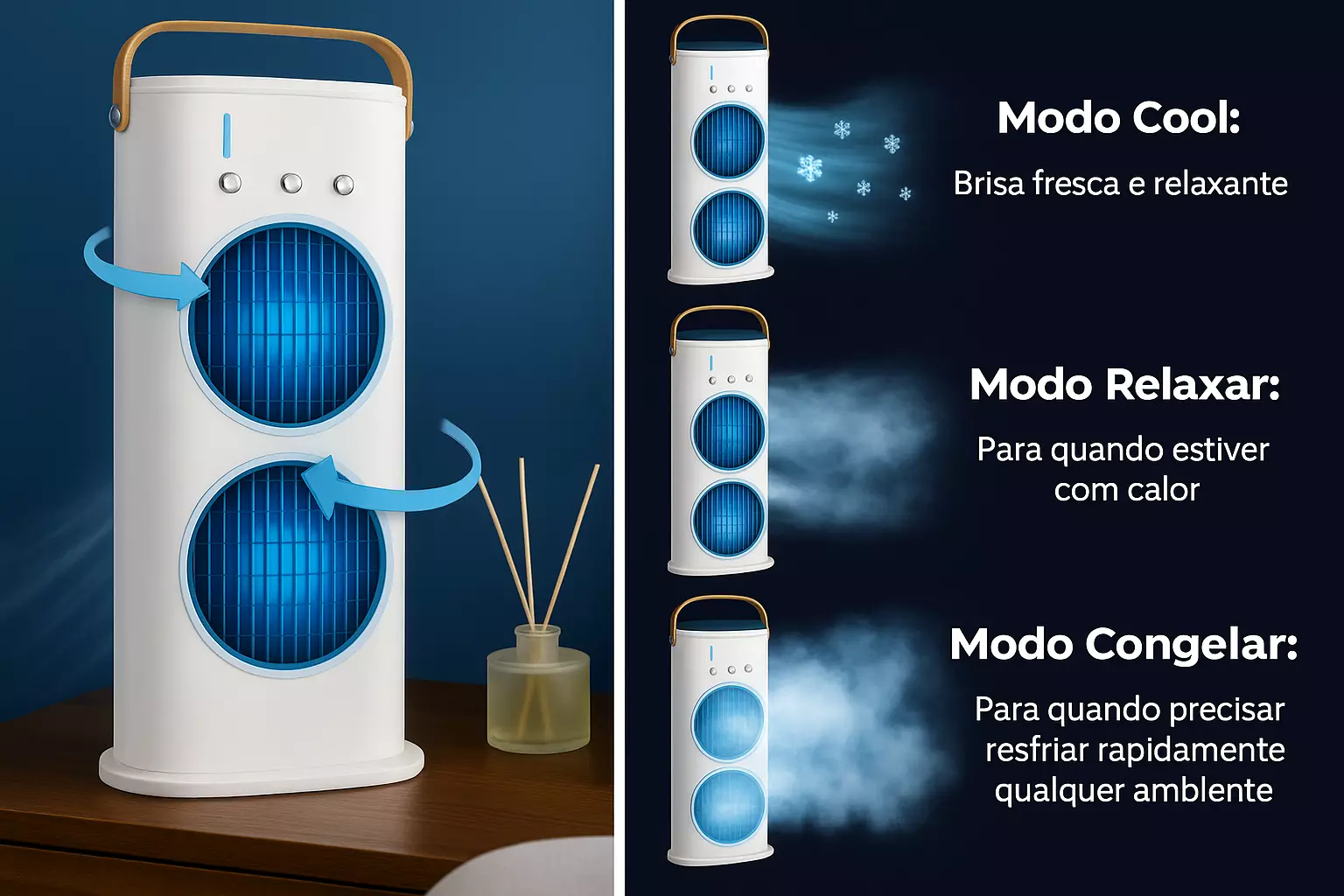 Seu design moderno garante uma operação quase silenciosa, perfeita para quem tem sono leve ou para quem quer um ambiente de trabalho fresco e silencioso.
